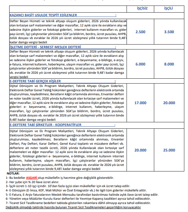Toplantıda belirlenen 2026 yılına ait dijital uyum ve hizmet giderleri katılım payı ücretlerinin “asgari” nitelikte olduğu, mükelleflerin faaliyet hacmi, işlem yoğunluğu ve çalışan sayısına göre farklılık gösterebileceği vurgulandı.