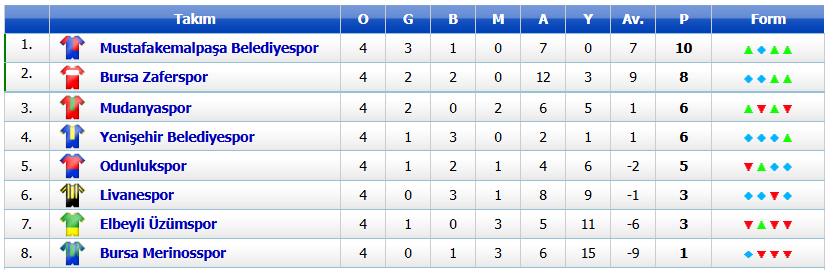 Temsilcimiz Belediye Mustafakemalpaşaspor grupta topaldığı 10 puan ile zirvede yer alıyor. Rakip Bursa Merinos ise 4 hafta sonunda henüz galibiyet yüzü görmezken, bir beraberlik ve 1 puan ile gurubun son sırasında bulunuyor.